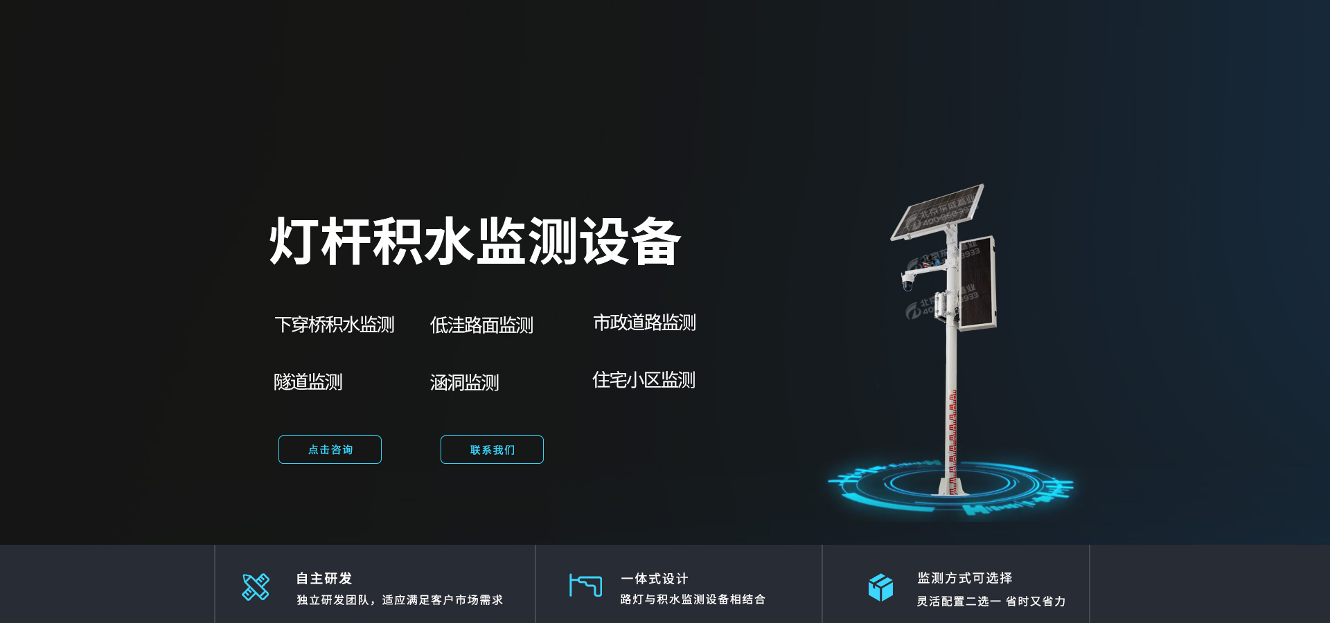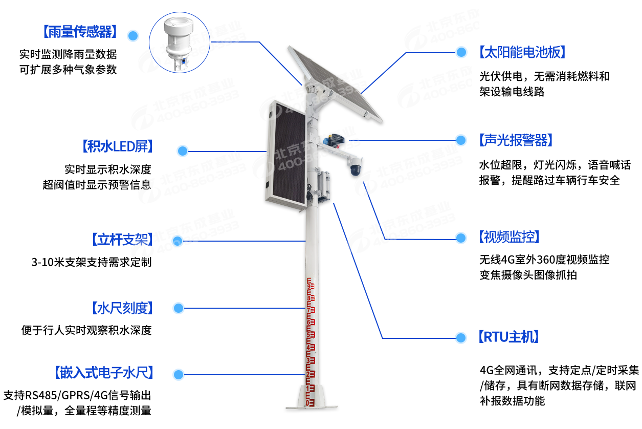 無需安裝地埋式液位計,通過立式燈桿上的水尺便可直觀觀測積水數據,可因地制宜選擇4G(全網通)、網口等上傳方式。